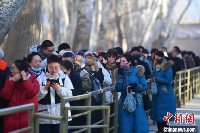 1月13日,甘肅敦煌莫高窟景區(qū)內(nèi),游人在工作人員引導(dǎo)下排隊(duì)參觀。中新社記者 李亞龍 攝