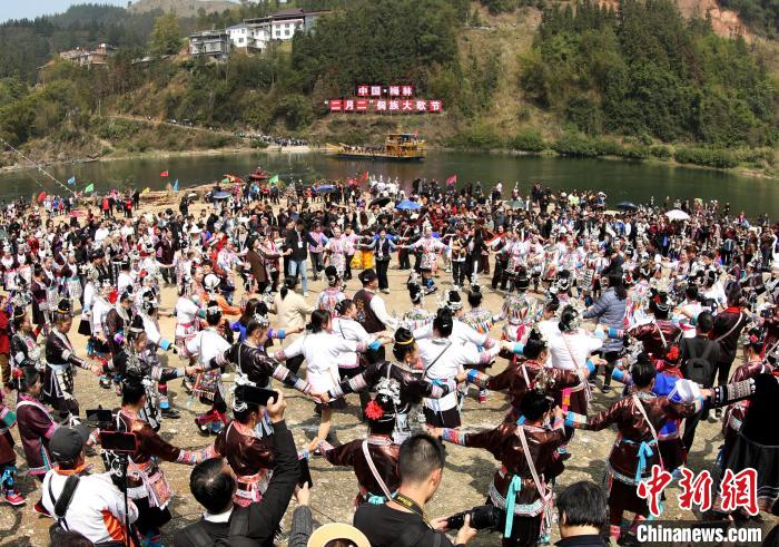 2024年3月11日,在廣西三江侗族自治縣梅林鄉(xiāng),“二月二”侗族大歌節(jié)活動吸引游客前來體驗侗鄉(xiāng)風(fēng)情。圖為民眾在跳多耶舞?! 蔷殑?nbsp;攝