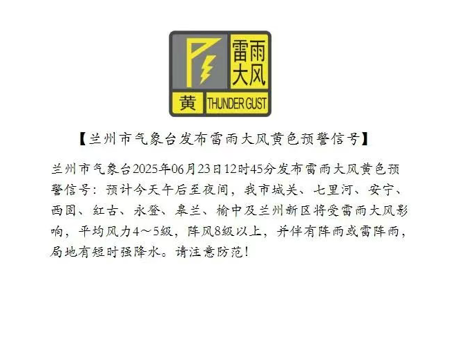 蘭州市氣象臺2025年06月23日12時45分發(fā)布雷雨大風黃色預(yù)警信號:預(yù)計今天午后至夜間,我市城關(guān)、七里河、安寧、西固、紅古、永登、皋蘭、榆中及蘭州新區(qū)將受雷雨大風影響,平均風力4~5級,陣風8級以上,并伴有陣雨或雷陣雨,局地有短時強降水。請注意防范!