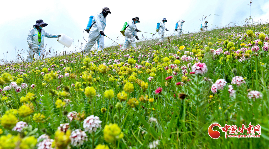 盛夏時(shí)節(jié),位于張掖市肅南裕固族自治縣的皇城夏日塔拉草原、康樂(lè)賽汗塔拉草原,宛如一塊巨大的綠色絨毯鋪向天際,滿目翠綠,令人心醉神迷。然而,此時(shí)也正是草原上狼毒花毒害草盛放、蝗蟲(chóng)繁殖的高峰期。連日來(lái),肅南縣林草專業(yè)技術(shù)人員帶領(lǐng)2000多牧民,抓住毒害草開(kāi)花、蝗蟲(chóng)繁殖最快,也是清除滅殺的最佳時(shí)機(jī),在“三北”工程六期160多萬(wàn)畝廣袤的草原上,打響了以“蟲(chóng)害防治+害草治理+噴施葉面+播撒草籽的”為核心的“三北”工程林草濕荒一體化保護(hù)修復(fù)攻堅(jiān)戰(zhàn)。