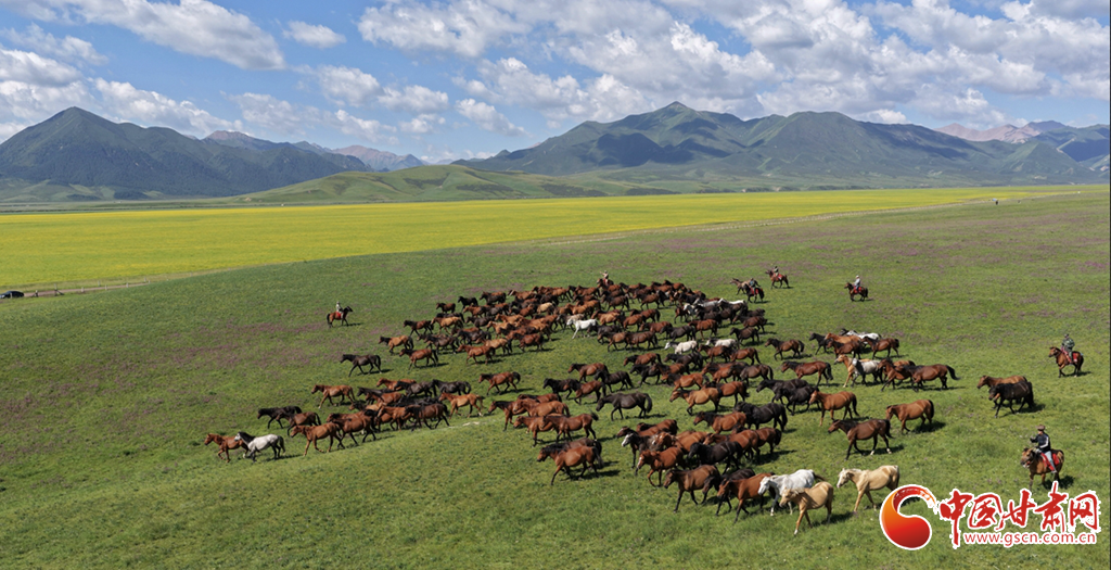 8月12日,在張掖山丹馬場(chǎng),一場(chǎng)駿馬奔騰的壯闊景象震撼上演。藍(lán)天如洗,白云似絮,遠(yuǎn)處連綿的山巒勾勒出雄渾的天際線,腳下黃綠交織的草原如巨幅織錦般鋪展。成群棕白相間的駿馬,似靈動(dòng)音符躍動(dòng)于綠野,騎手身姿矯健,與奔騰的馬群、遼闊的天地渾然一體,盡顯草原的壯美景象。