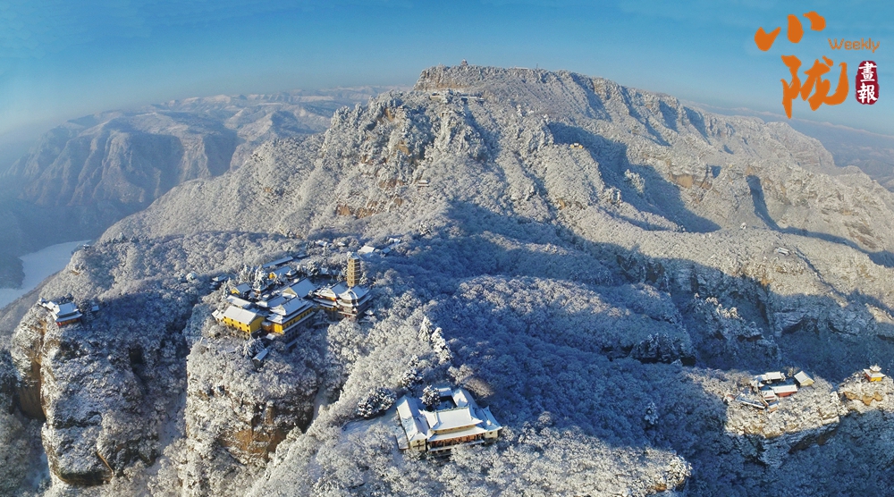 群山裹素,起伏的線條在極致湛藍(lán)的天穹下舒展,積雪壓彎枝頭,形成道道玉弧。而點綴其間的廟宇樓閣,默然佇立,飛檐上的殘雪泛著微光,與這片寧靜的藍(lán)白色調(diào)共同構(gòu)成一幅和諧、安詳?shù)男麓貉┚啊?/p>