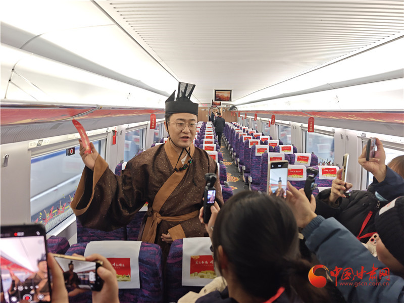 為讓旅客沉浸式感受隴原文脈,22名身著特色服飾的專業(yè)講解員在車廂間流動(dòng)講解,將文物背后的故事娓娓道來。