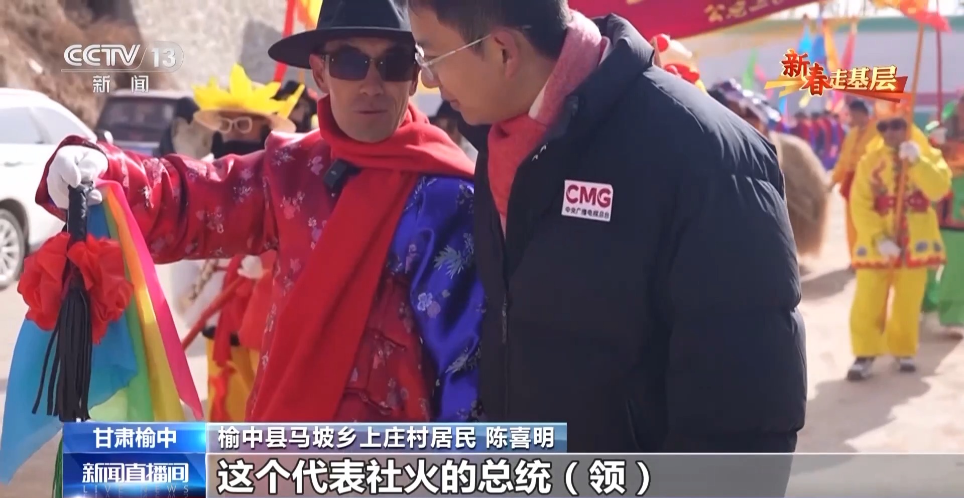 榆中縣馬坡鄉(xiāng)上莊村居民 陳喜明:這個代表社火的總統(tǒng)領(lǐng),是給我們引場子的,社火就是把大家召集到一起,前段時間這里遭災(zāi),搞個社火把大家的精神提一提。