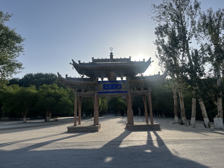 大牌坊是莫高窟另一處標志性景觀。要進入莫高窟窟區(qū),首先得經過這座莊重質樸、飛檐翹角的牌坊。牌坊匾額東面是“石室寶藏”,西面是“三危攬勝”,夕陽西下時,更顯古韻。