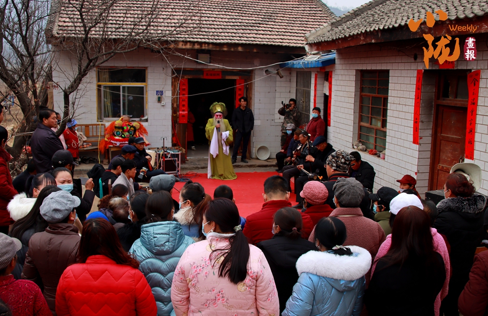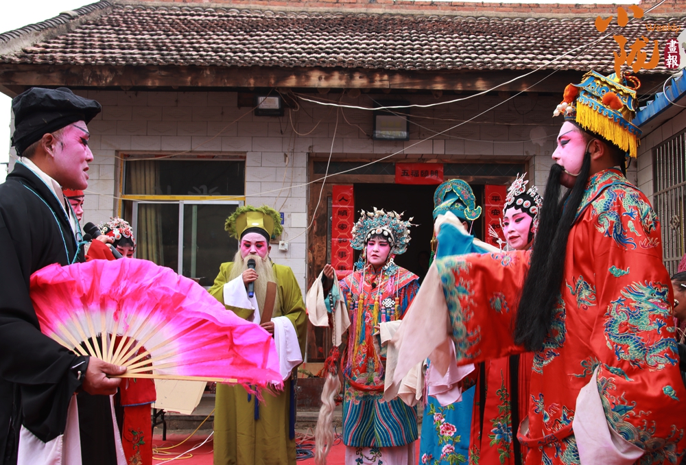 在鄉(xiāng)村院落里,一位身著傳統(tǒng)戲服、頭戴精致頭飾的演員站在鋪著紅地毯的簡易舞臺上,手持道具投入表演。臺下圍滿了村民,大家神情專注,整個場景充滿濃郁的鄉(xiāng)土氣息與傳統(tǒng)民俗韻味。