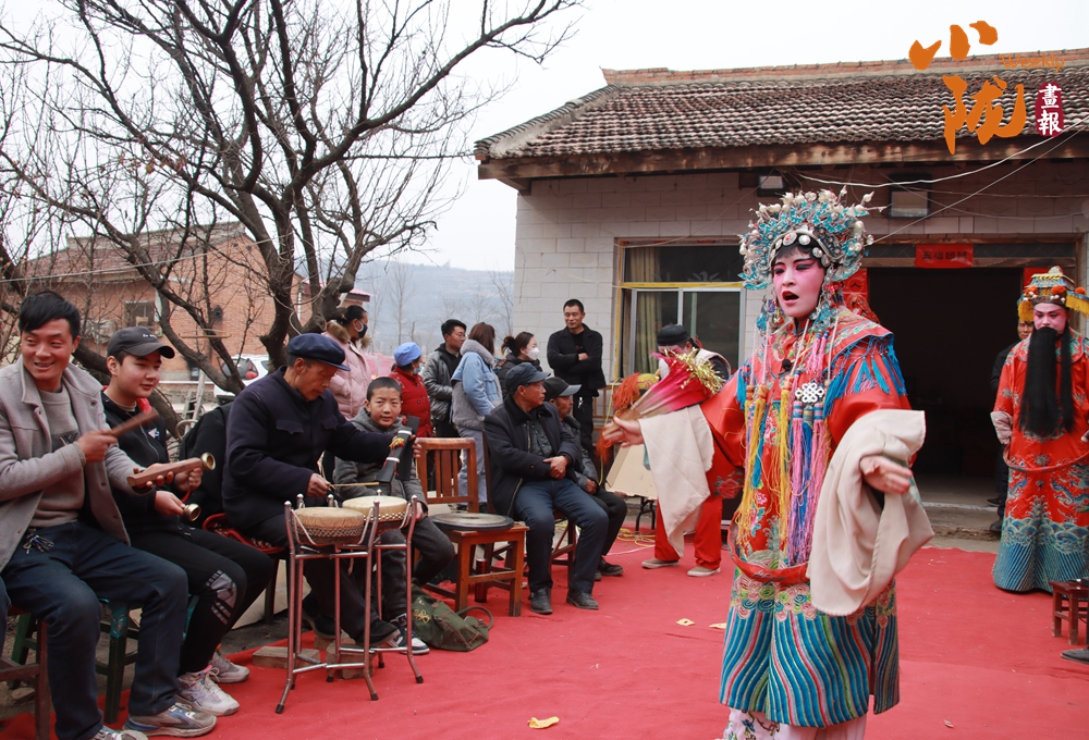 民居門口的舞臺上,多位扮相精致的演員依次亮相,或持扇或執(zhí)巾,唱腔婉轉(zhuǎn)、身段靈動。臺下村民圍得水泄不通,不少人舉著手機(jī)定格精彩瞬間,伴奏的鑼鼓弦樂聲里,滿是濃郁的鄉(xiāng)土氣息。