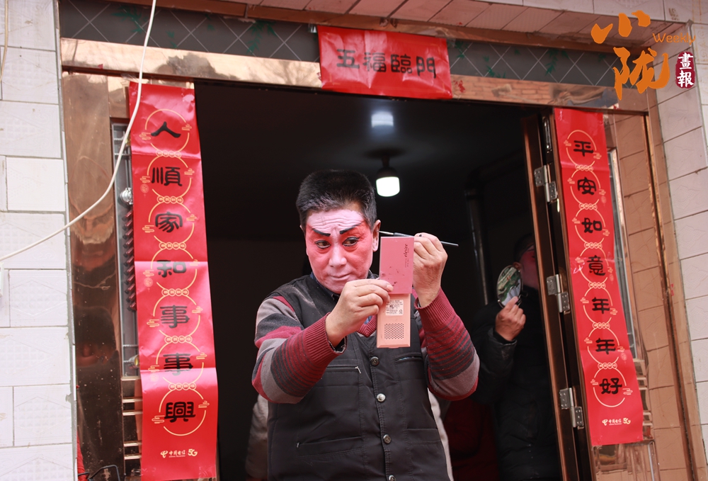 貼著紅春聯(lián)的屋門口,一位畫著戲曲臉譜的演員正對著手機(jī)調(diào)整妝容。這充滿鄉(xiāng)土氣息的戲曲準(zhǔn)備場景,滿是民間年俗里熱鬧又質(zhì)樸的煙火氣,也藏著傳統(tǒng)藝術(shù)在鄉(xiāng)土間的鮮活傳承。