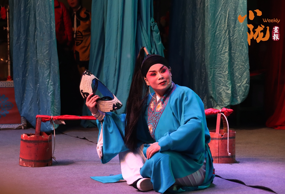 舞臺的藍(lán)幕前,一位演員正以跪坐的姿態(tài)投入表演,身著繡著精致紋樣的青藍(lán)色戲服,手持折扇,眉眼間滿是戲韻。臺側(cè)的紅色水桶、幕后的隱約人影,讓這充滿程式化的舞臺瞬間多了幾分鄉(xiāng)土演出的真實感。